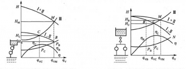 這表明,兩臺泵并聯(lián)時的流量等于并聯(lián)時各臺泵流量之和,如果和一臺泵單獨工作時的流量相比,則兩臺泵并聯(lián)后的總流量qVM小于一臺泵單獨工作時流量qvc的兩倍,而大于一臺泵單獨工作時的流量qvc。因為并聯(lián)后泵的流量qVB較gvc為小。并聯(lián)時的揚程比每臺泵單獨工作時要高一些。為什么并聯(lián)后每臺泵的流量qvB小于不并聯(lián)時每臺泵單獨工作時的流量qvc,而揚程HB又大于揚程Hc呢?這是因為管道摩擦損失隨著流量的增加而增大了。這就需要每臺泵都提高它的揚程來克服這個增加的管路阻力損失,故HB大于Hc,因而流量就相應減少了。